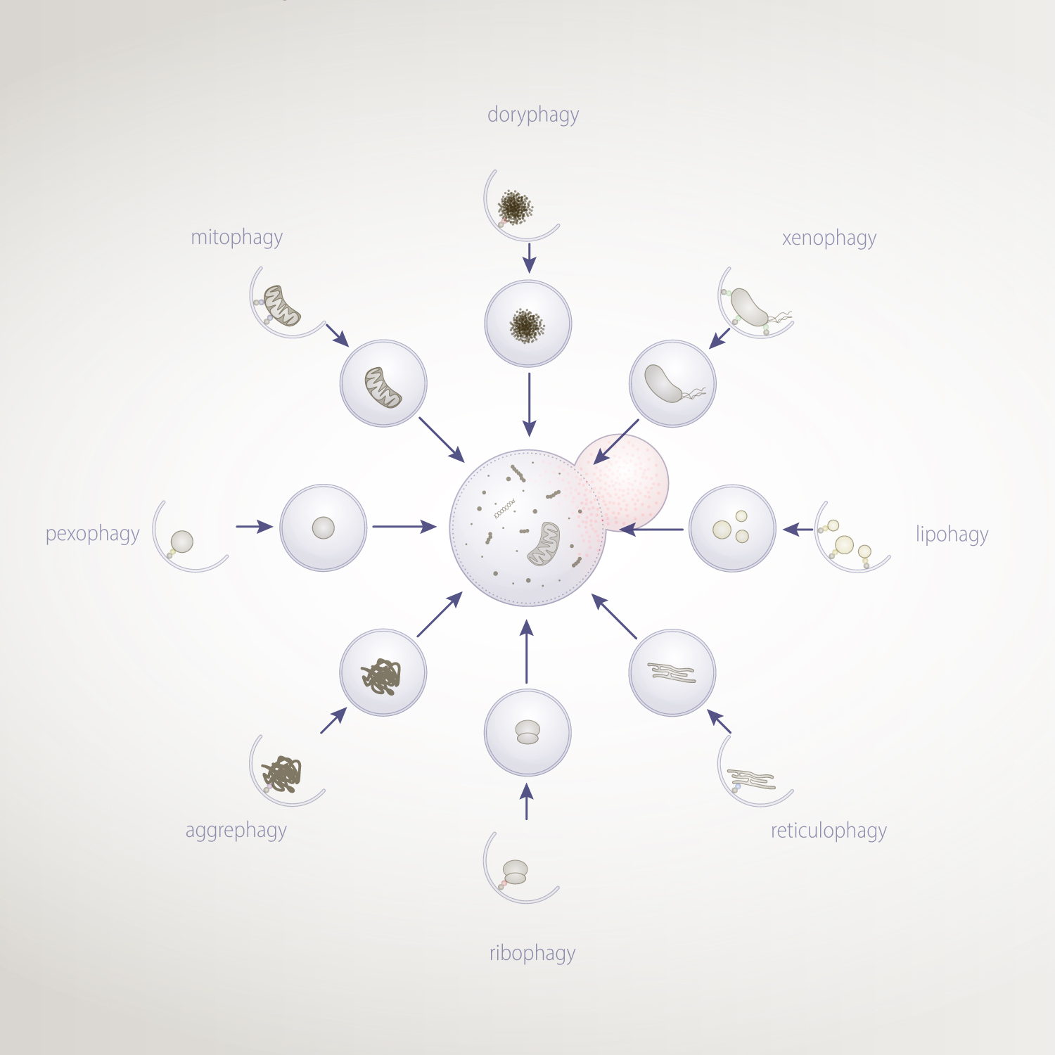 Depicted the names usually used to refer to selective autophagy of mitochondria (mitophagy), peroxisomes (pexophagy), protein aggregates (aggrephagy), ribosomes (ribophagy), endoplasmic reticulum (reticulophagy), lipid droplets (lipophagy), pathogens (xenophagy) and centriolar satellies (doryphagy).